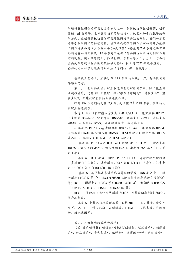 总体投资思路上,主要分为(1)创新药板块;(2)其他板块的思路和思考。
