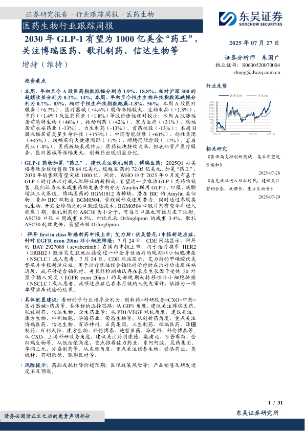 医药生物行业跟踪周报:2030年GLP-1有望为1000亿美金“药王”关注博瑞医药、歌礼制药、信达生物等