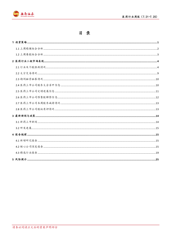 风险提示:医药行业政策风险超预期;研发进展不及预期风险;业绩不及预期风险。