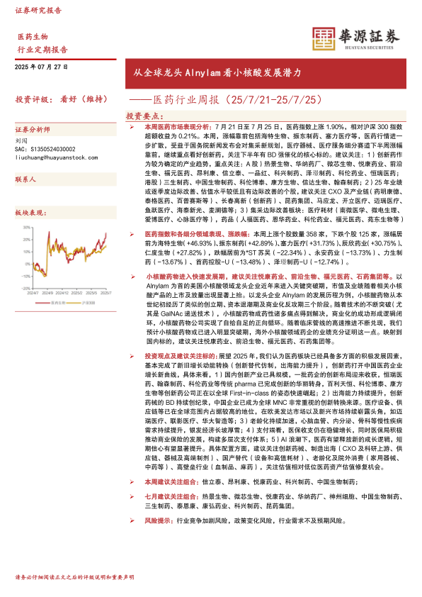 医药行业周报:从全球龙头Alnylam看小核酸发展潜力