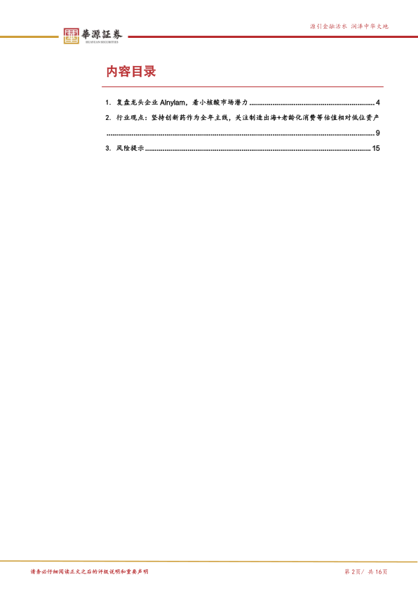 小核酸药物进入快速发展期,建议关注悦康药业、前沿生物、福元医药、石药集团等。以Alnylam为首的美国小核酸领域龙头企业近年来进入关键突破期,市值及业绩随着相关小核酸产品的上市及放量出现显著上抬。以龙头企业Alnylam的发展历程为例,小核酸药物从本世纪初经历了类似的创立期、资本退潮期及商业化反攻期三个阶段。随着技术的不断突破(尤其是GalNAc递送技术),小核酸药物成药性诸多痛点得到解决,商业化的成功形成逻辑闭环,小核酸药物公司实现了自给自足的正向循环。随着临床管线的高速推进不断兑现,我们预计小核酸药物或已进入明显突破期,海外小核酸领域药企的业绩充分证明这一点。映射到国内标的,建议关注悦康药业、前沿生物、福元医药、石药集团等。