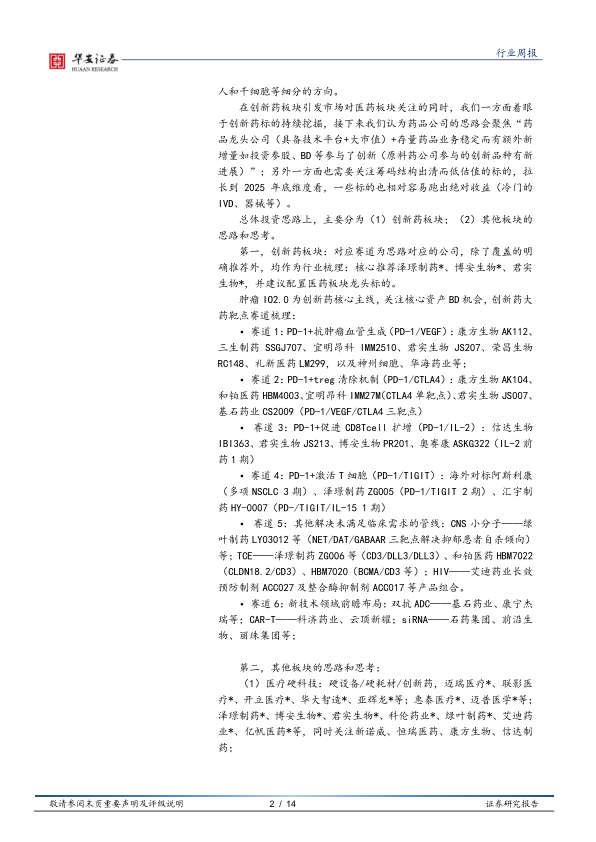 总体投资思路上,主要分为(1)创新药板块;(2)其他板块的思路和思考。