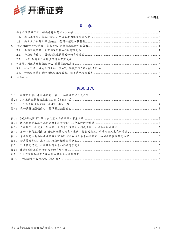 集采政策优化基调明确,推动行业高质量发展。第十一批集采标志着政策从“扩面降价”转向“精细化管理”,通过规则优化避免恶性低价竞争,强化质量与供应保障。2025年7月15日国采办正式发布第十一批集采名单,55个产品正式启动信息填报,同时公布68个满足条件但“暂不纳入”的药品,集采政策优化力度显著。第十一批集采聚焦临床成熟老药,明确集采非新药、新药不集采原则。这一规则本质上为创新药划出政策安全边界——已上市多年、过专利期的仿制药面临价格竞争,而处于专利保护期内的创新药则独享市场定价权。此外6月30日出台的《支持创新药高质量发展的若干措施》从审评审批、医保准入等多维度为创新药护航,政策组合拳下,创新药正从研发投入期迈向价值兑现期,持续推动行业高质量发展。