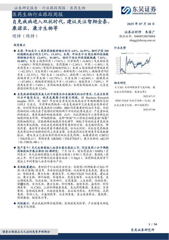 医药生物行业跟踪周报:自免疾病进入双抗时代,建议关注智翔金泰康诺亚,康方生物等