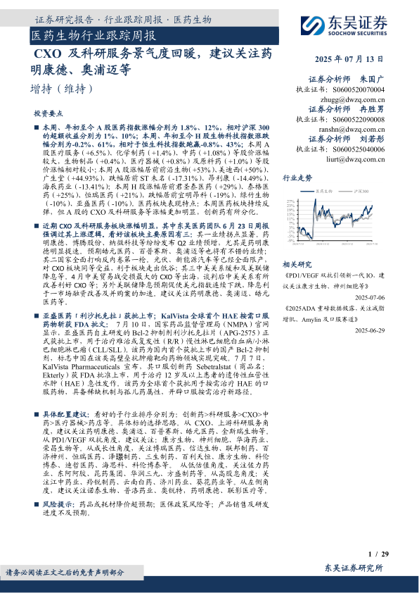 近期CXO及科研服务板块涨幅明显,其中东吴医药团队6月23日周报强调过其上涨逻辑。看好该板块主要原因有三:其一业绩拐点显著。药明康德、博腾股份、纳微科技等纷纷发布Q2业绩预增,尤其是药明康德明显提速。预期皓元医药、百普赛斯、奥浦迈等也将有不错的业绩;其二国家全面打响反内卷第一枪。光伏、新能源汽车等已经全面限产,对CXO板块同等受益,利于板块走出低谷;其三中美关系缓和及美联储降息等。4月中美贸易战受损最大的CXO等出海,谈判后中美关系有所改善利好CXO等;另外美联储降息预期促使美元指数连续下跌,降息利于一市场融资改善及并购案的加速。建议关注药明康德、奥浦迈、皓元医药等。