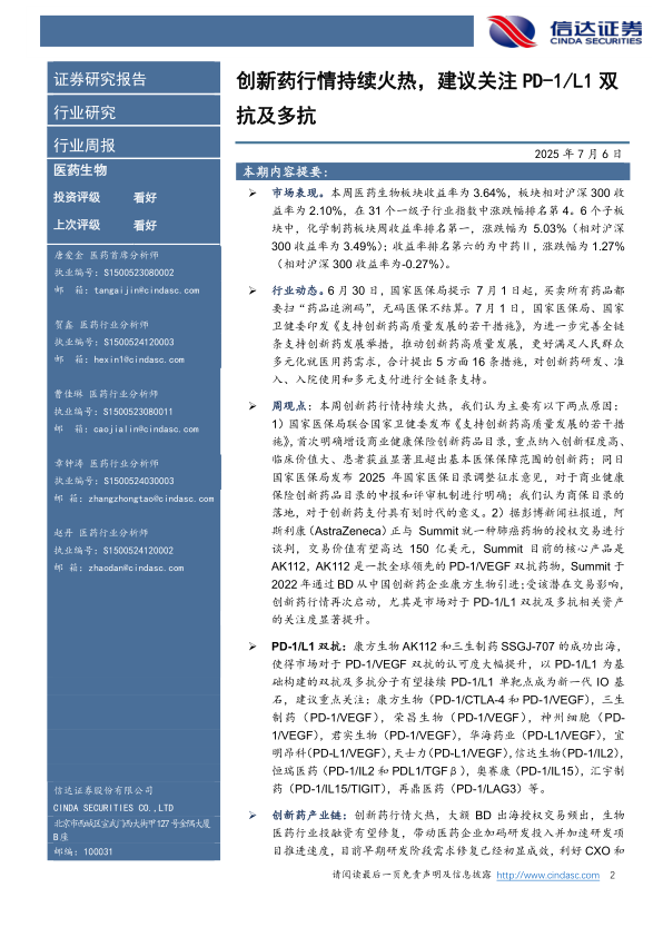 周观点:本周创新药行情持续火热,我们认为主要有以下两点原因:1)国家医保局联合国家卫健委发布《支持创新药高质量发展的若干措施》,首次明确增设商业健康保险创新药品目录,重点纳入创新程度高、临床价值大、患者获益显著且超出基本医保保障范围的创新药;同日国家医保局发布2025年国家医保目录调整征求意见,对于商业健康保险创新药品目录的申报和评审机制进行明确;我们认为商保目录的落地,对于创新药支付具有划时代的意义。2)据彭博新闻社报道,阿斯利康(AstraZeneca)正与Summit就一种肺癌药物的授权交易进行谈判,交易价值有望高达150亿美元,Summit目前的核心产品是AK112,AK112是一款全球领先的PD-1/VEGF双抗药物,Summit于2022年通过BD从中国创新药企业康方生物引进;受该潜在交易影响,创新药行情再次启动,尤其是市场对于PD-1/L1双抗及多抗相关资产的关注度显著提升。