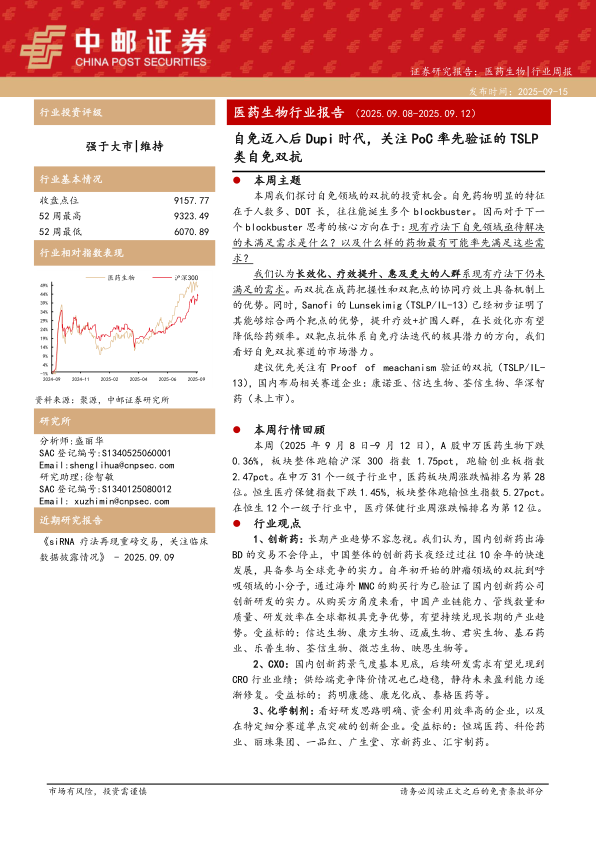 医药生物行业周报:自免迈入后Dupi时代,关注PoC率先验证的TSLP类自免双抗