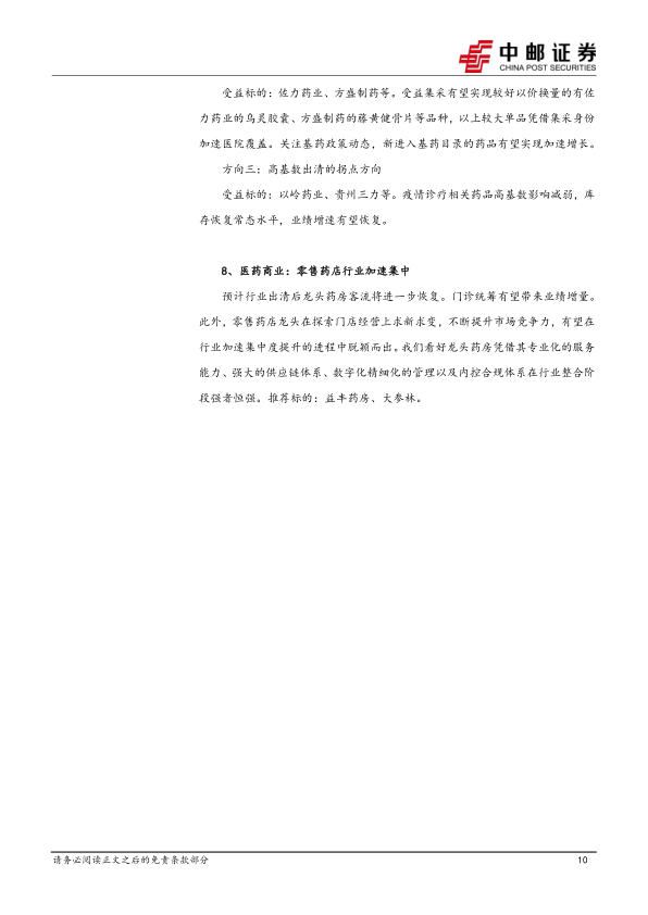 7、中药:看好受益集采有望实现较好以价换量的有佐力药业的乌灵胶囊、方盛制药的藤黄健骨片等品种,以上较大单品凭借集采身份加速医院覆盖。关注基药政策动态,新进入基药目录的药品有望实现加速增长。以及疫情诊疗相关药品高基数影响减弱,库存恢复常态水平,业绩增速有望恢复。受益标的:佐力药业、方盛制药、以岭药业、贵州三力等。