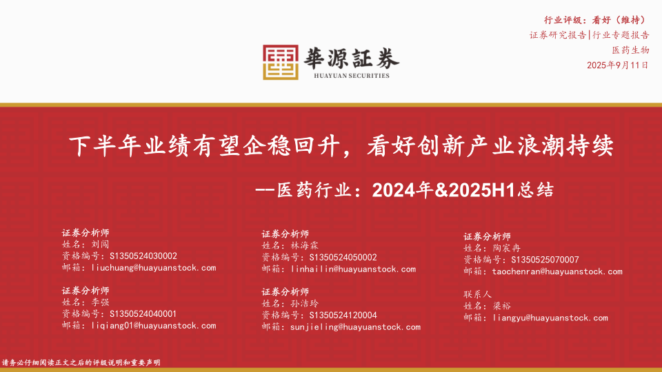 医药行业:2024年&2025H1总结:下半年业绩有望企稳回升,看好创新产业浪潮持续