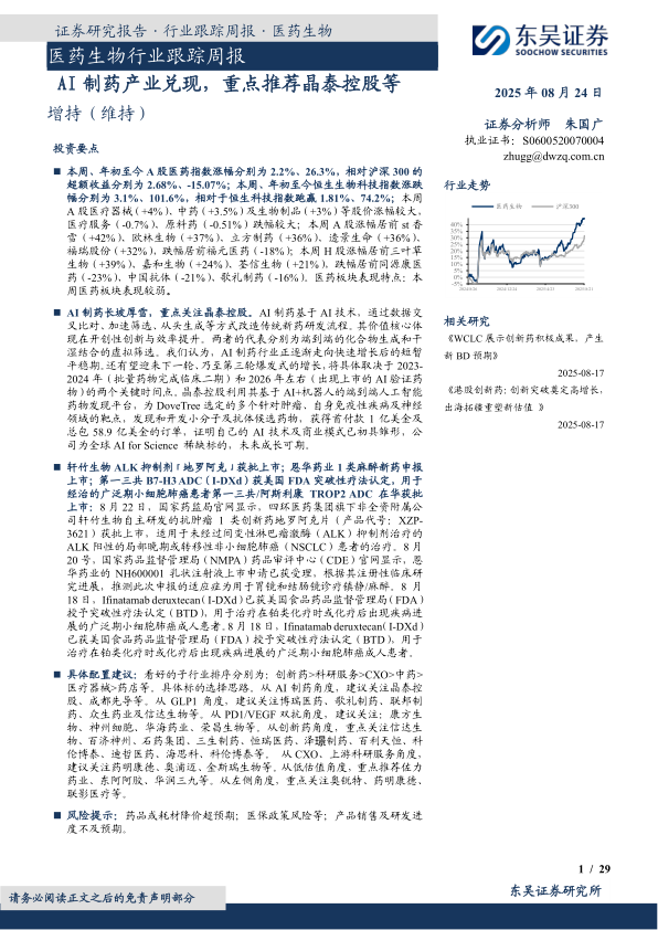 医药生物行业跟踪周报:AI制药产业兑现,重点推荐晶泰控股等