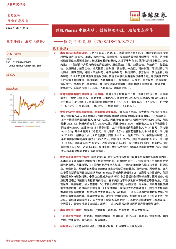 医药行业周报:传统Pharma中报亮眼、创新转型加速,继续重点推荐