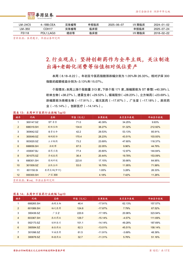 本周医药市场表现分析:8月18日至8月22日,医药指数上涨1.05%,相对沪深300指数超额收益为-3.13%。本周,欧林生物、福瑞股份、立方制药等公司涨幅居前,中药、医疗器械细分赛道本周涨幅靠前,继续重点看好创新药,关注下半年有BD强催化的核心标的。建议关注:1)创新药作为较为确定的产业趋势,重点关注:A股)热景生物、华纳药厂、微芯生物、悦康药业、前沿生物、福元医药、昂利康、信立泰、一品红、科兴制药、泽璟制药、科伦药业、恒瑞医药;港股)三生制药、中国生物制药、科伦博泰、康方生物、信达生物、翰森制药;2)25年业绩或逐季度边际改善、估值水平较低且有边际改善的个股,建议关注CXO及产业链(药明康德、泰格医药、百普赛斯等)、昆药集团、马应龙、开立医疗、迈瑞医疗、鱼跃医疗、海泰新光、麦澜德等;3)集采边际改善板块:医疗耗材(南微医学、微电生理、爱博医疗、心脉医疗等),药品(人福医药、恩华药业等)。