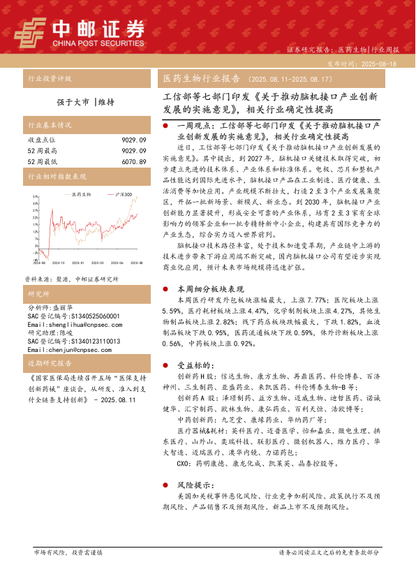 医药生物行业报告:工信部等七部门印发《关于推动脑机接口产业创新发展的实施意见》,相关行业确定性提高