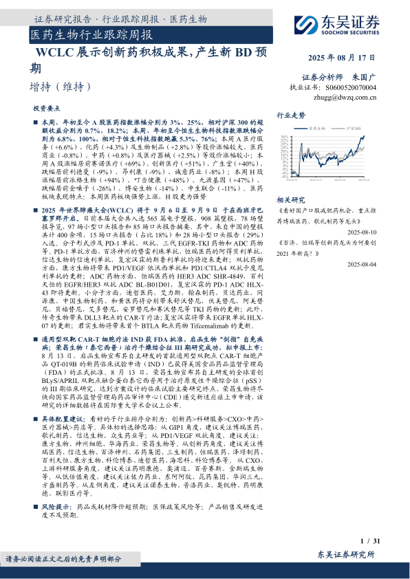 医药生物行业跟踪周报:WCLC展示创新药积极成果,产生新BD预期