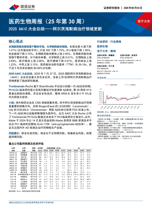 医药生物周报(25年第30周):2025AAIC大会总结-阿尔茨海默病治疗领域更新