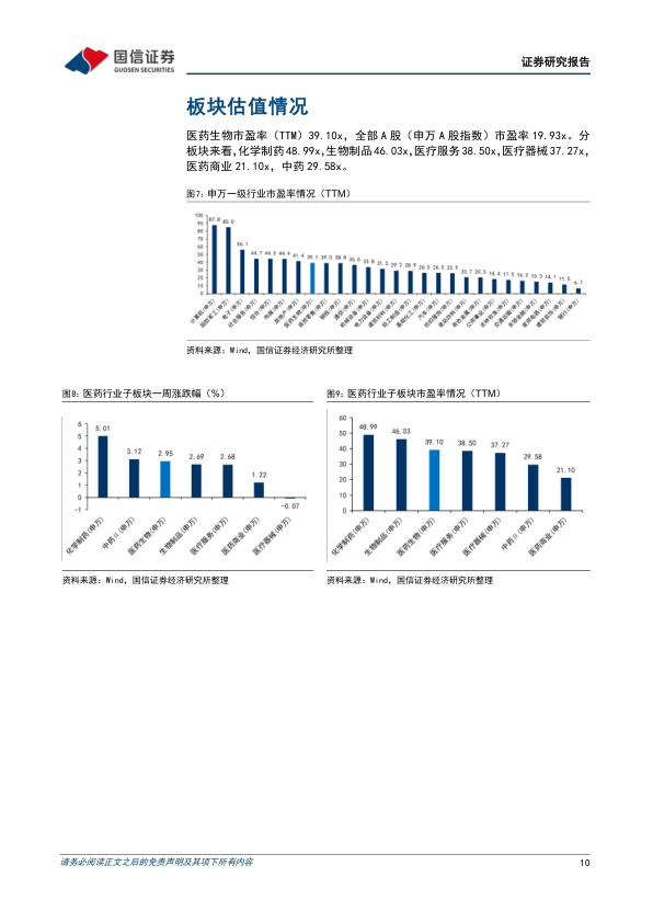 本周医药板块表现强于整体市场,化学制药板块领涨。本周全部A股下跌1.01%(总市值加权平均),沪深300下跌1.75%,中小板指下跌1.95%,创业板指下跌0.74%,生物医药板块整体上涨2.95%,生物医药板块表现强于整体市场。分子板块来看,化学制药上涨5.01%,生物制品上涨2.69%,医疗服务上涨2.68%,医疗器械下跌0.07%,医药商业上涨1.22%,中药上涨3.12%。医药板块当前市盈率(TTM)为39.10x,处于近5年历史估值的80.69%分位数。