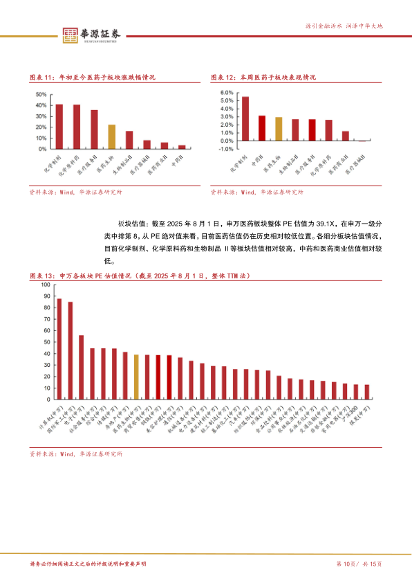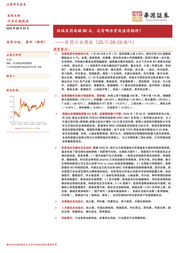 本周医药市场表现分析:7月28日至8月1日,医药指数上涨2.95%,相对沪深300指数超额收益为4.7%。本周,南新制药、利德曼、辰欣药业等公司涨幅居前,医药行情进一步扩散,化学制剂、中药细分赛道本周涨幅靠前,继续重点看好创新药,关注下半年有BD强催化的核心标的。建议关注:1)创新药作为较为确定的产业趋势,重点关注:A股)热景生物、华纳药厂、微芯生物、悦康药业、前沿生物、福元医药、昂利康、信立泰、一品红、科兴制药、泽璟制药、科伦药业、恒瑞医药;港股)三生制药、中国生物制药、科伦博泰、康方生物、信达生物、翰森制药;2)25年业绩或逐季度边际改善、估值水平较低且有边际改善的个股,建议关注CXO及产业链(药明康德、泰格医药、百普赛斯等)、昆药集团、马应龙、开立医疗、迈瑞医疗、鱼跃医疗、海泰新光、麦澜德等;3)集采边际改善板块:医疗耗材(南微医学、微电生理、爱博医疗、心脉医疗等),药品(人福医药、恩华药业等)。