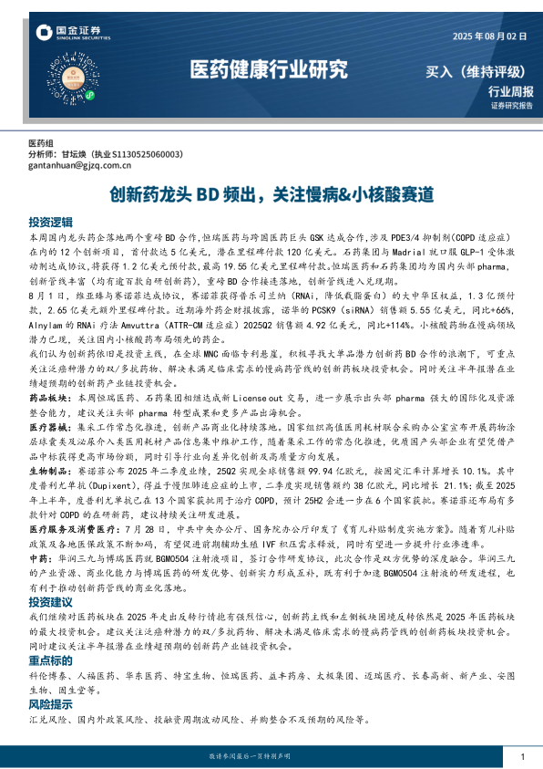 医药健康行业周报:创新药龙头BD频出,关注慢病&小核酸赛道