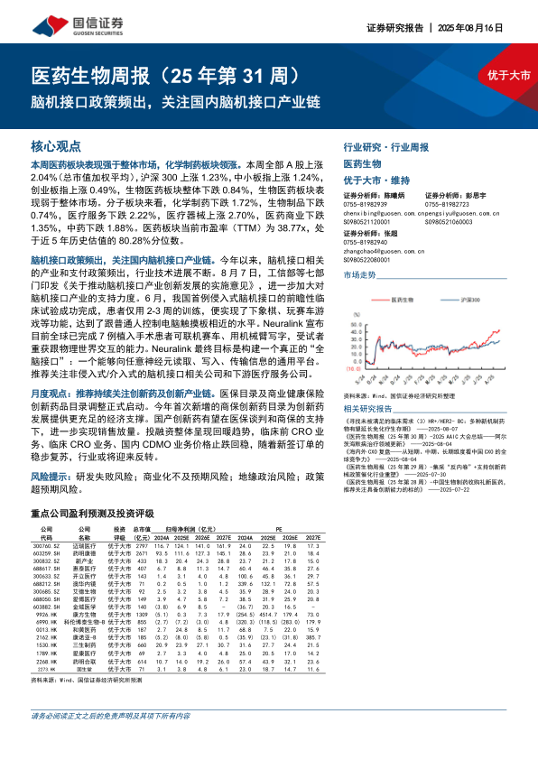 医药生物行业周报(25年第31周):脑机接口政策频出,关注国内脑机接口产业链