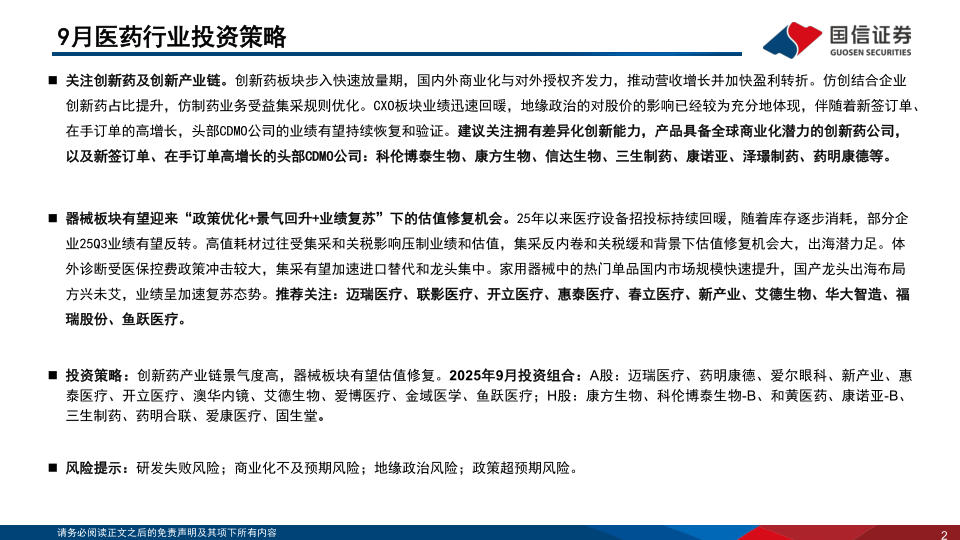 医药生物行业2025年9月投资策略:创新药产业链景气度高,器械板块有望估值修复