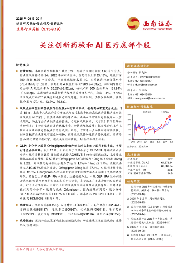 政策支持新型创新器械国际化发展+加速审评审批,创新药械有望充分受益。9月15日,上海市人民政府办公厅正式印发《上海市促进高端医疗器械产业全链条发展行动方案》,聚焦高端医学影像产品、高端人工智能医疗器械等八大重点领域,涵盖了全产业链条支持措施。与过往政策相比,《方案》国际化导向更加明显:支持企业通过并购优化布局,加快国际化发展;探索境外已上市且国内未注册的医疗器械在沪先行试用。此外,方案进一步加快审评审批流程,创新器械商业化落地有望更加顺畅。预计此政策将加速国产替代进程,目前外资品牌优势窗口期收窄,建议关注创新药械、AI医疗等投资机会。