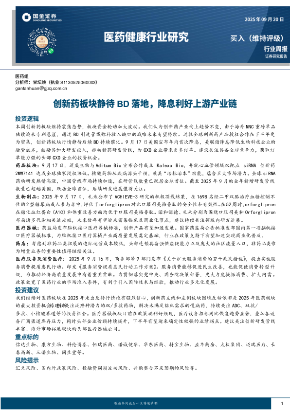 医药健康行业研究:创新药板块静待BD落地,降息利好上游产业链