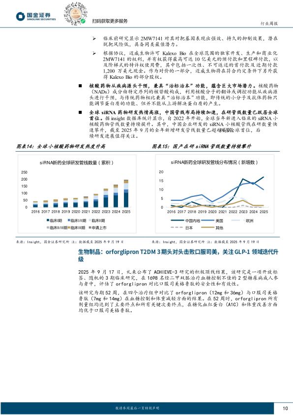 药品板块:9月17日,迈威生物与AditumBio宣布合作成立KalexoBio,并就心血管领域双靶点siRNA创新药2MW7141达成全球独家授权协议。核酸药物从疾病源头干预,兼具“治标治本”功能,蕴含巨大市场潜力。全球siRNA药物研发热情高涨,中国管线布局持续加速,在研管线数量已跃居全球首位。截至2025年9月的全年新增研发管线数量已超越美国,跃居全球首位,后续研发进展值得关注。