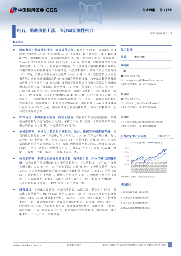 投资建议:本周化工品价格、价差表现较弱。估值方面,截至9月19日,石油化工和基础化工PE(TTM)分别为21.6x、28.1x,较2014年以来的历史均值15.8x、28.2x溢价水平分别为36.8%、-0.5%。建议关注以下三条投资主线:一是,聚焦内需主线,把握成长确定性机会,如民爆、钾肥、磷化工、改性塑料等;二是,关注供给侧约束,探寻周期弹性机会,涤纶长丝、有机硅、制冷剂等;三是,赋能新质生产力,新材料国产替代或提速,如成核剂、电子级PPO、COC/COP、PI薄膜等。