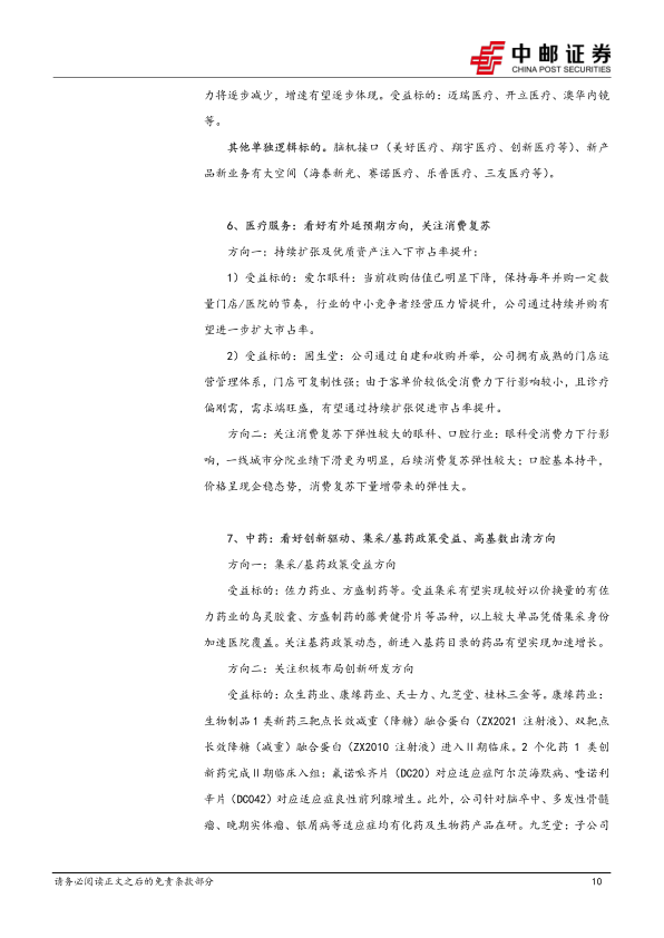 6、医疗服务:看好持续扩张及优质资产注入下市占率提升以及消费复苏下弹性较大的眼科、口腔行业。受益标的:爱尔眼科、固生堂。