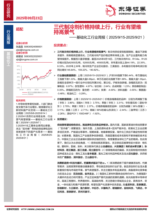 基础化工行业周报:三代制冷剂价格持续上行,行业有望维持高景气
