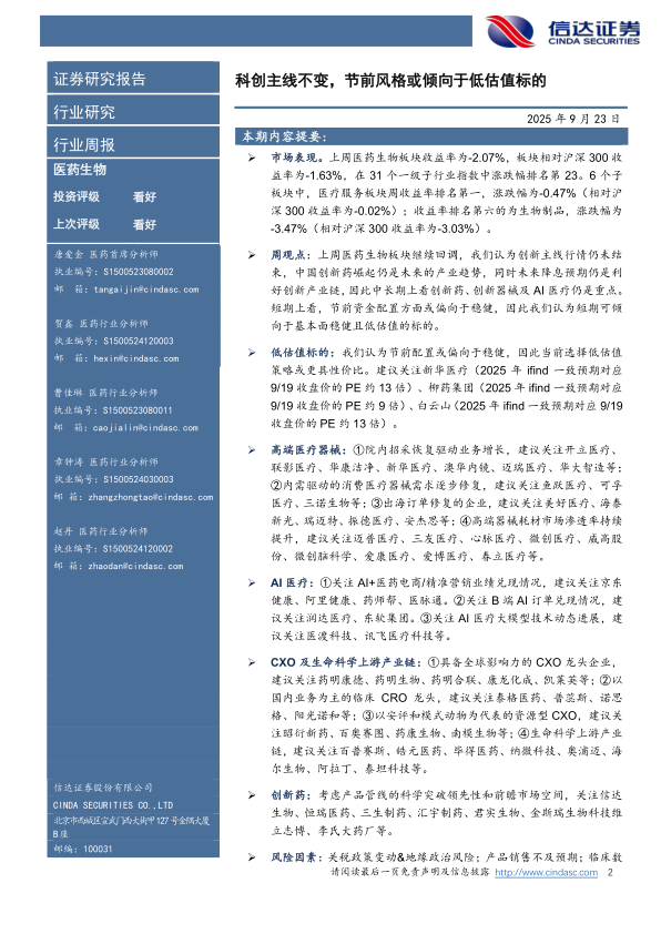 低估值标的:我们认为节前配置或偏向于稳健,因此当前选择低估值策略或更具性价比。建议关注新华医疗(2025年ifind一致预期对应9/19收盘价的PE约13倍)、柳药集团(2025年ifind一致预期对应9/19收盘价的PE约9倍)、白云山(2025年ifind一致预期对应9/19收盘价的PE约13倍)。