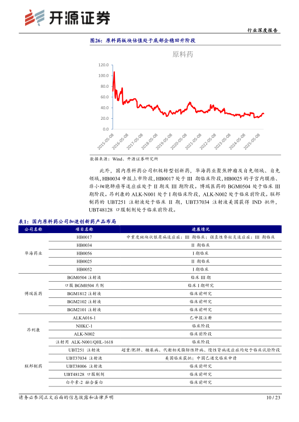 原料药行业经历近4年周期下行,各类产品价格跌至部分龙头企业处于亏损的阶段,行业整体处于底部区域,其中沙坦类、肝素类、动保类等价格跌到历史最低水平。受抗感染类产品价格大幅下跌及部分公司加大研发投入影响,2025上半年原料药板块收入及净利润呈现下降趋势。