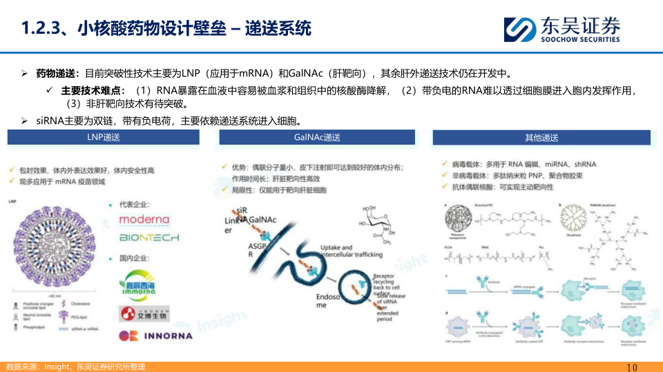 MNC纷纷下注小核酸领域,其中我国小核酸研发实力凸显:全球范围内小核酸药物再起风云,进入BD高潮,诺华、AZ、渤健、礼来、辉瑞、罗氏、GSK、赛诺菲等纷纷下注小核酸领域。与我国药企相关的交易包括,靖因药业与CRISPR近9亿美金的共同开发项目,苏州瑞博与勃林格殷格翰总交易金额超20亿美元,赛诺菲以1.3亿美元预付款引进Arrowhead子公司维亚臻的一个管线的大中华区权益,舶望制药与诺华合作金额超52亿美金等。