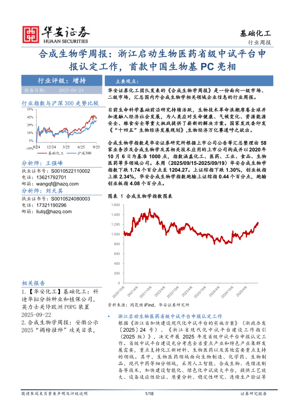 合成生物学指数是华安证券研究所根据上市公司公告等汇总整理由 58家业务涉及合成生物学及其相关技术应用的上市公司构成并以2020年10 月 6 日为基准 1000 点,指数涵盖化工、医药、工业、食品、生物医药等多领域公司。 本周(2025/09/15-2025/09/19)华安合成生物学指数下跌 1.74 个百分点至 1204.27。上证综指下跌 1.30%,创业板指上涨 2.34%,华安合成生物学指数跑输上证综指 0.44 个百分点,跑输创业板指 4.08 个百分点。