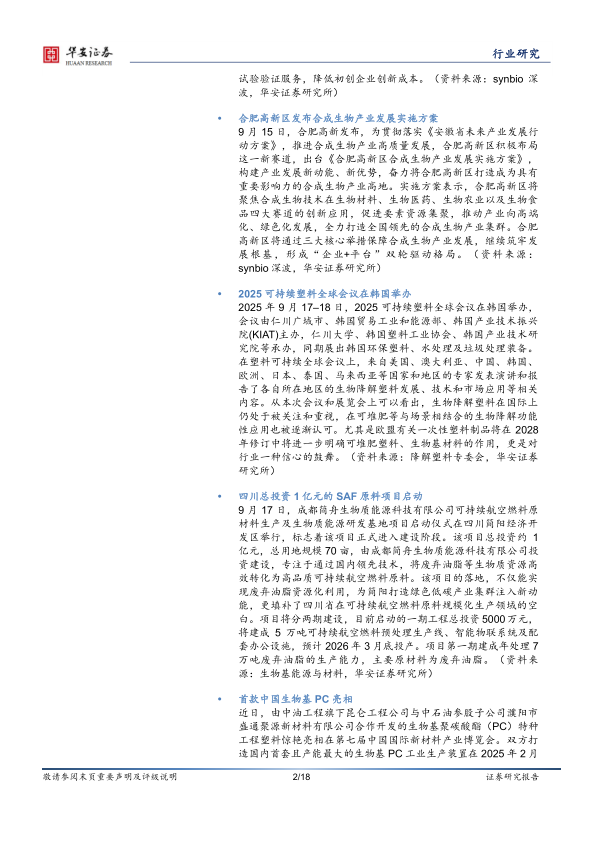 2025 年 9 月 17–18 日, 2025 可持续塑料全球会议在韩国举办,会议由仁川广域市、韩国贸易工业和能源部、韩国产业技术振兴院(KIAT)主办,仁川大学、韩国塑料工业协会、韩国产业技术研究院等承办,同期展出韩国环保塑料、水处理及垃圾处理装备。在塑料可持续全球会议上,来自美国、澳大利亚、中国、韩国、欧洲、日本、泰国、马来西亚等国家和地区的专家发表演讲和报告了各自所在地区的生物降解塑料发展、技术和市场应用等相关内容。从本次会议和展览会上可以看出,生物降解塑料在国际上仍处于被关注和重视,在可堆肥等与场景相结合的生物降解功能性应用也被逐渐认可。尤其是欧盟有关一次性塑料制品将在 2028年修订中将进一步明确可堆肥塑料、生物基材料的作用,更是对行业一种信心的鼓舞。(资料来源: 降解塑料专委会,华安证券研究所)