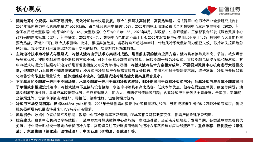 投资建议:数算中心机架功率持续提升,液冷方案可解决数算中心高能耗、高散热难题。当前液冷板块处于发展早期,各类液冷方案各具优劣势,行业尚未形成统一既定的最优液冷方案,需密切关注下游服务商选择的液冷方案路径与对应冷却液产品。重点推荐:巨化股份(氟化液)、东岳集团(氟化液、改性硅油)、中国石油(矿物油、合成油)等。
