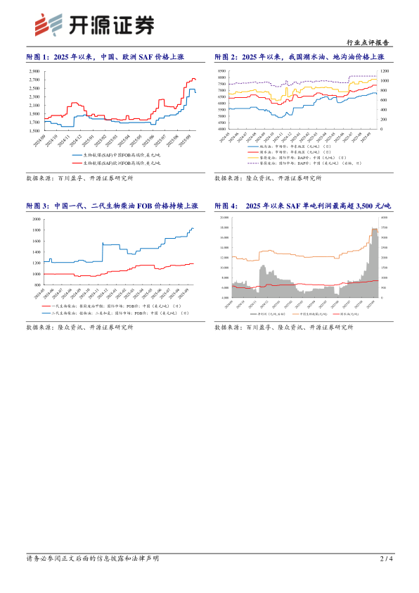 据百川盈孚数据,截至9月24日,欧盟、中国SAF FOB价格分别为2,705、2,400美元/吨,分别较2025年年初+46%、+33%;潲水油不含税价格7,400元/吨,较2025年初+15%。据我们计算,9月24日中国SAF单吨利润超3,000元/吨,2025年以来单吨利润最高超3,500元/吨。近期SAF需求向好而海外供应减少,国内SAF景气增加带动原料UCO供需偏紧,UCO-SAF产业链价格同步上涨。供应方面,9月3日,壳牌荷兰石油公司不再重启建设大型生物燃料厂的计划;此前壳牌公司已叫停在佩尔尼斯的生物燃料工厂建设;芬兰芬欧汇川集团在5月宣布退出鹿特丹项目。据NESTE2025年中报,NESTE预计在2025年4季度对鹿特丹工厂、12月对新加坡工厂均进行为期6周的检修。4月9日NESTE鹿特丹工厂50万吨SAF投产后,其SAF总产能达到150万吨,未来短期NESTE工厂陆续检修将使得国外SAF供给减少。国内镇海炼化SAF装置复工时间延长至11-12月,9月中旬张家港HVO/SAF工厂(35万吨)停机检修,国内外SAF装置检修频发,SAF供应持续短缺。需求方面,9月12日,欧盟拨1.18亿美元ETS配额支持航空采购SAF;9月22日,新加坡宣布将在2026年推出SAF税以支持新加坡2026年实现1%SAF添加目标;国内方面,预计2025年下半年将推出SAF第三阶段试点,将试点范围拓展至全国省会机场。短期SAF全球需求稳步增长,远期进入2027年,CORSIA要求成员国家强制推出SAF掺混比例,2050年实现航空业净零排放,SAF需求蓬勃发展。综上,SAF未来需求或快速增长,但海外新增产能较少,国内SAF工厂有望凭借较为充足的UCO资源持续获取全球SAF市场份额,UCO-SAF产业链景气有望持续增长。