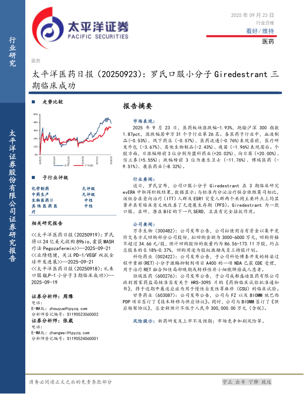 2025年9月23日,医药板块涨跌幅-1.93%,跑输沪深300指数1.87pct,涨跌幅居申万31个子行业第26名。各医药子行业中,血液制品(-0.53%)、线下药店(-0.57%)、医药流通(-0.76%)表现居前,医疗研发外包(-3.67%)、其他生物制品(-2.43%)、疫苗(-1.96%)表现居后。个股方面,日涨幅榜前3位分别为盟科药业(+20.02%)、向日葵(+20.00%)、信立泰(+5.55%);跌幅榜前3位为康乐卫士(-11.76%)、博瑞医药(-9.51%)、康辰药业(-8.32%)。