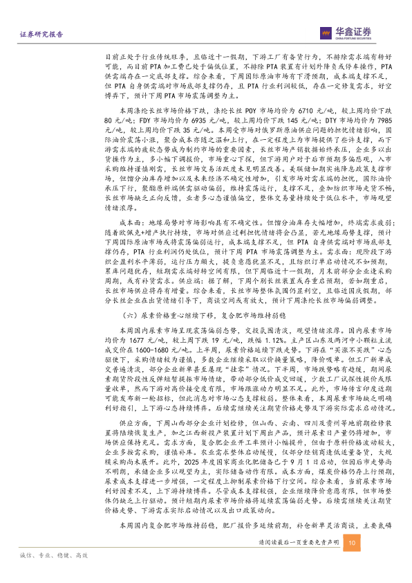 化工产品价格方面,本周部分产品有所反弹,其中本周上涨较多的有:硫磺上涨4.53%,醋酸上涨3.26%,棉短绒上涨3.03%,环氧丙烷上涨2.62%等,但仍有不少产品价格下跌,其中硫酸下跌23.87%,硝酸下跌6.06%,环氧氯丙烷下跌5.68%,三氯吡啶醇钠下跌4.62%。从化工行业中报业绩表现来看,行业整体仍处于弱势,各细分子行业业绩涨跌不一。主要原因是受行业过去两年产能扩张进入新一轮产能周期以及需求偏弱影响,但也有部分子行业表现超预期,例如润滑油行业等。此外,建议重视草甘膦、化肥、进口替代、纯内需、高股息资产等方向的投资机会。具体建议如下:首先是建议重视有望进入景气周期的草甘膦行业。草甘膦行业目前经营困难,底部特征明显,库存持续下降,价格近期开始上涨,在海外进入补库存周期的大背景下,行业有可能进入景气周期,继续推荐江山股份、兴发集团、扬农化工等;第二,在行业整体机会不多的情况下,精选竞争格局和盈利能力相对较好且具备量增的成长性个股。持续看好竞争格局较好的润滑油添加剂行业中具备持续成长性且空间广阔的国内龙头瑞丰新材、盈利能力相对较好的煤制烯烃行业中具备量增逻辑且估值较低的宝丰能源;第三,在关税不确定性的影响下,出口预计会受到影响,内循环需要承担更多的增长责任,化工行业中产业链在国内且主要需求也在国内的有化学肥料行业及部分农药行业中的子产品,其中氮肥和磷肥、复合肥自给自足内循环,需求相对刚性,继续看好华鲁恒升、新洋丰、云天化、亚钾国际、中国心连心化肥、利民股份等,中国心连心化肥做重点推荐。最后,在国际油价上涨的背景下,我们继续看好具有最高资产质量和高股息率特征的三桶油。化工行业中云天化、兴发集团、龙佰集团等细分子领域龙头企业也有5%左右股息率,在红利资产中具有较强吸引力。