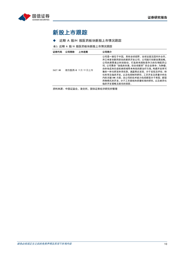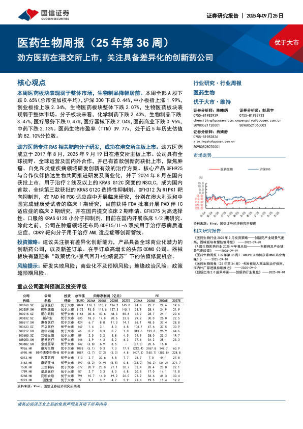 医药生物周报(25年第36周):劲方医药在港交所上市,关注具备差异化的创新药公司