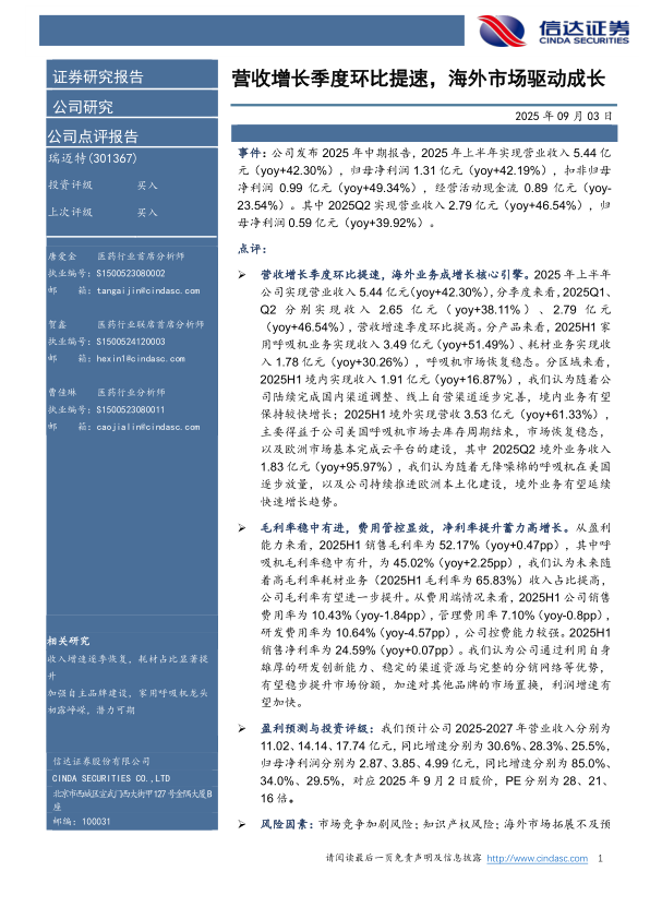 瑞迈特2025年中报显示,公司营收增长显著,尤其二季度环比提速,海外市场成为核心驱动力。家用呼吸机和耗材业务均实现增长,境外市场表现亮眼,主要受益于美国市场复苏和欧洲市场拓展。