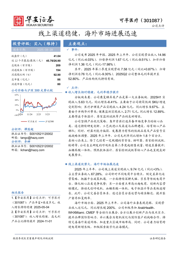 公司坚持产品优化策略,集中资源打造具备市场竞争力的核心品类,通过持续研发创新、工艺改进以及渠道与品牌建设,培育核心产品梯队;同时,对盈利能力偏弱、发展潜力有限的低效品类及产品型号实施战略性调整。2025年上半年,公司毛利率同比增加1.8个百分点。在核心品类上,除了已经有一定规模的背背佳、助听器、居家检测试纸、轮椅等,公司自主研发的呼吸机自第二季度起销售放量,增速显著提升;血糖尿酸一体机、预热款体温计、居家检测试纸等核心产品也呈现良好发展势头。