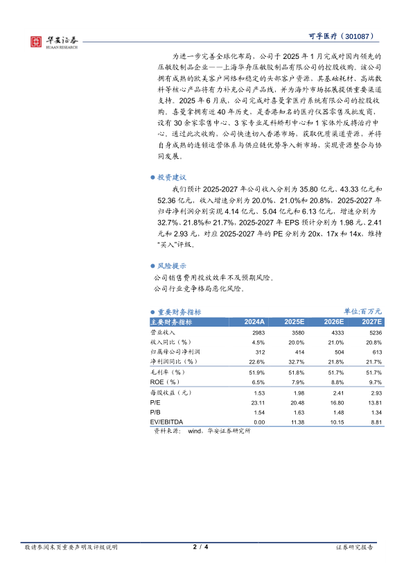我们预计2025-2027年公司收入分别为35.80亿元、43.33亿元和52.36亿元,收入增速分别为20.0%、21.0%和20.8%,2025-2027年归母净利润分别实现4.14亿元、5.04亿元和6.13亿元,增速分别为32.7%、21.8%和21.7%,2025-2027年EPS预计分别为1.98元、2.41元和2.93元,对应2025-2027年的PE分别为20x、17x和14x,维持“买入”评级。