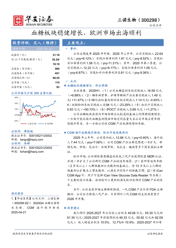2025年上半年,公司国内收入12.66亿元(yoy+5.40%),海外收入7.44亿元(yoy+7.06%)。公司CGM产品注册范围进一步扩大,新增巴西、伊朗、尼泊尔、白俄罗斯、乌拉圭、越南等多个国家获批注册证。