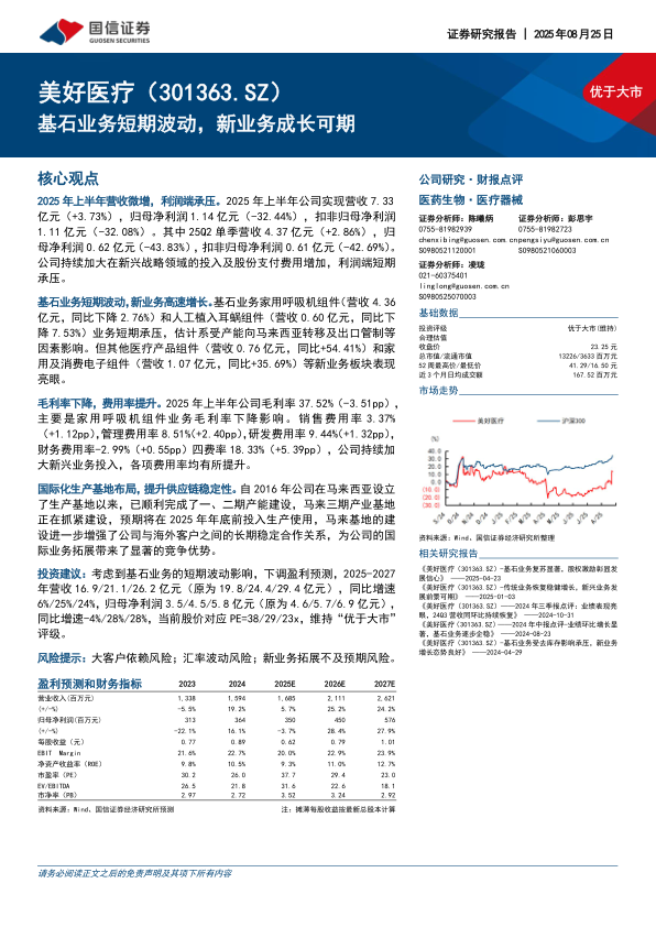 投资建议:考虑到基石业务的短期波动影响,下调盈利预测,2025-2027年营收16.9/21.1/26.2亿元(原为19.8/24.4/29.4亿元),同比增速6%/25%/24%,归母净利润3.5/4.5/5.8亿元(原为4.6/5.7/6.9亿元),同比增速-4%/28%/28%,当前股价对应PE=38/29/23x,维持“优于大市”评级。
