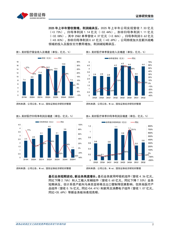 2025年上半年营收微增,利润端承压。2025年上半年公司实现营收7.33亿元(+3.73%),归母净利润1.14亿元(-32.44%),扣非归母净利润1.11亿元(-32.08%)。其中25Q2单季营收4.37亿元(+2.86%),归母净利润0.62亿元(-43.83%),扣非归母净利润0.61亿元(-42.69%)。公司持续加大在新兴战略领域的投入及股份支付费用增加,利润端短期承压。