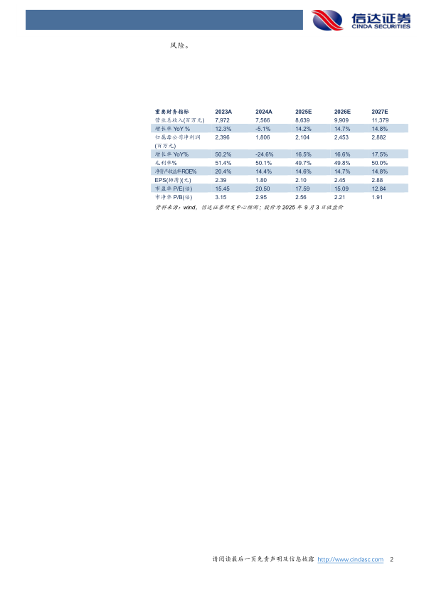 盈利预测与投资评级:我们预计公司2025-2027年营业收入分别为86.39、99.09、113.79亿元,同比增速分别为14.2%、14.7%、14.8%,实现归母净利润为21.04、24.53、28.82亿元,同比分别增长16.5%、16.6%、17.5%,对应2025年9月3日股价PE分别为18、15、13倍,维持“买入”投资评级。