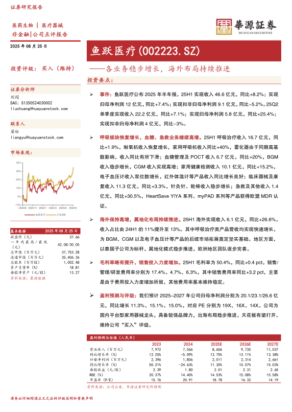 华源证券维持对鱼跃医疗“买入”评级,主要基于公司作为国内平台型家用器械龙头的品牌优势和持续推进的出海战略。预计公司2025-2027年归母净利润将保持稳定增长,对应PE估值具有吸引力。