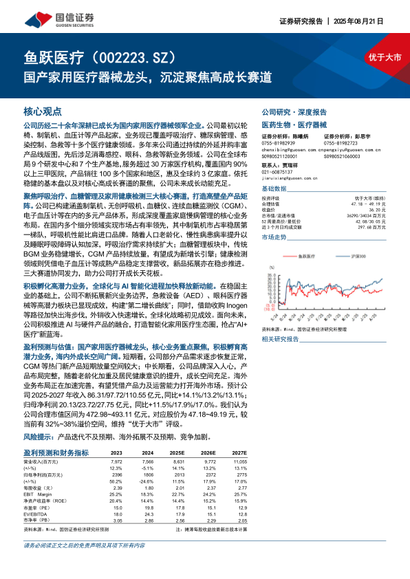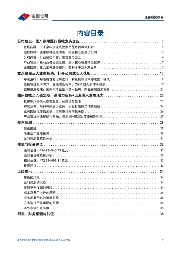 盈利预测与估值:国产家用医疗器械龙头,核心业务重点聚焦,积极孵育高潜力业务,海内外成长空间广阔。短期看,公司部分产品需求逐步恢复正常,CGM等热门新产品短期放量空间较大;中长期看,公司品牌深入人心,产品布局完整,随着老龄化加重及居民健康意识的提升,成长空间充足。海外业务布局正在加速完善,有望凭借产品力及运营能力打开海外市场。预计公司2025-2027年收入86.31/97.72/110.55亿元,同比+14.1%/13.2%/13.1%;归母净利润20.13/23.72/27.75亿元,同比+11.5%/17.9%/17.0%。我们认为公司合理市值区间为472.98~493.11亿元,对应股价为47.18~49.19元,较当前有32%~38%溢价空间,维持“优于大市”评级。