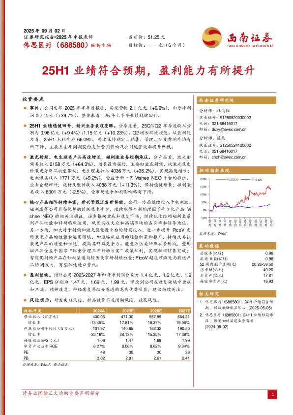 盈利预测。预计公司2025-2027年归母净利润分别为1.4亿元、1.6亿元、1.9亿元,EPS分别为1.47元、1.69元、1.99元。考虑到公司在康复领域中盆底和产康、精神康复、神经康复等细分赛道的龙头优势明显,建议持续关注。